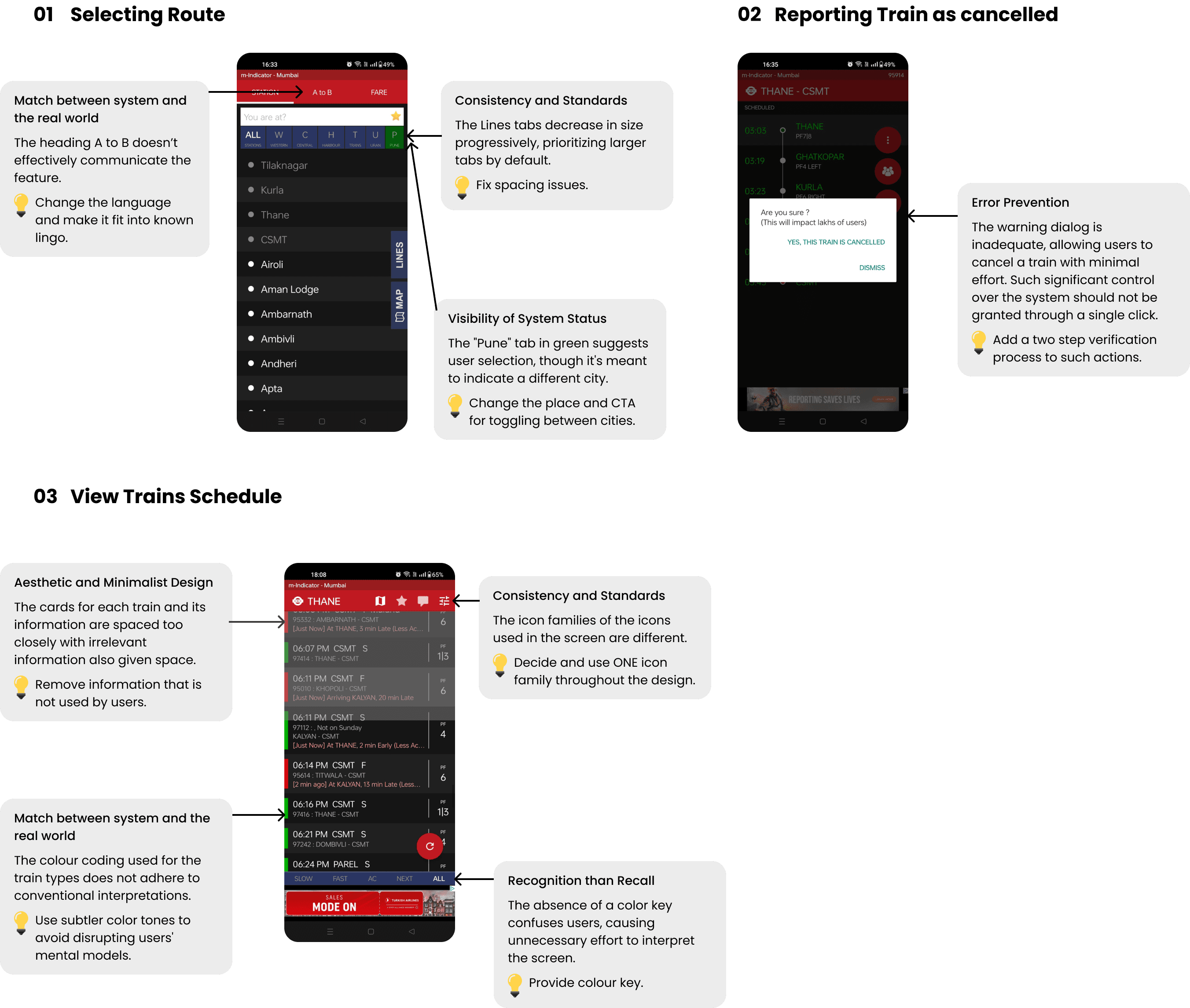 The heuristic evaluation conducted for the key flows of the Local train section pin-pointed a few heuristic issues in the UI of the app.